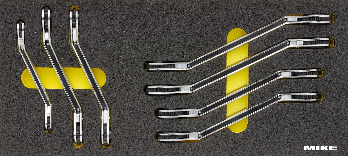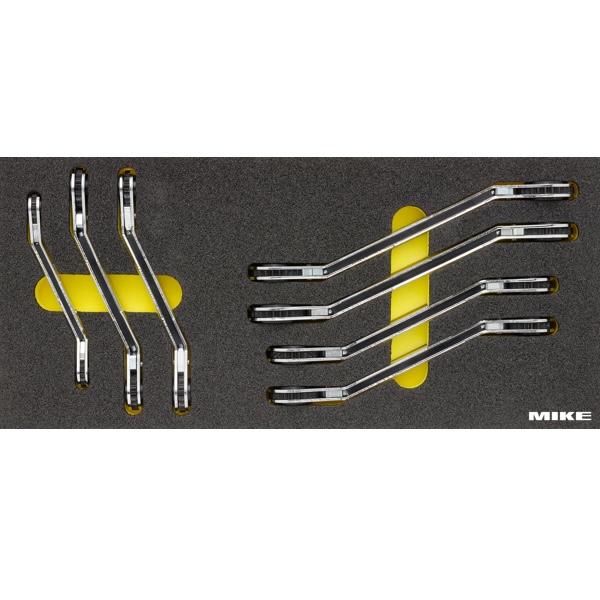 Mỗi cây cờ lê có kích cỡ kép gồm: 8×9 mm, 10×11 mm, 12×13 mm, 14×15 mm, 16×17 mm, 18×19 mm và 21×22 mm. Đáp ứng đa dạng các kích thước bu lông tiêu chuẩn. Khay đựng làm bằng vật liệu foam cứng phủ PU chống dầu, có kích thước module chuẩn 41,0 × 18,9 cm, chiếm đúng 1/3 ngăn kéo tủ đồ nghề.