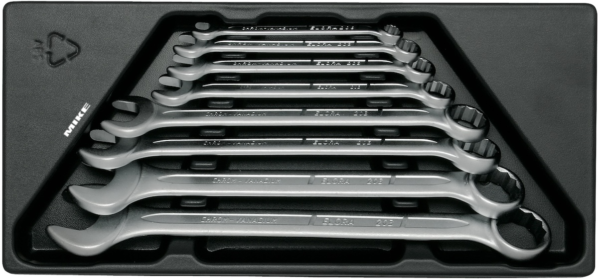 Các cờ lê trong bộ này có thiết kế cong (bent) và được xử lý bề mặt mạ chrome mờ. Chúng có kích thước từ 8, 10, 11, 13, 17, 19, 22 đến 24 mm thuộc dòng cờ lê ELORA 203, phù hợp với nhiều nhu cầu sử dụng khác nhau trong công việc lắp ráp và bảo trì. Các cờ lê này được thiết kế với chiều dài ngắn, phù hợp cho việc làm việc trong không gian hạn chế, và cả hai đầu của cờ lê đều có cùng kích cỡ mở miệng, tăng khả năng linh hoạt khi sử dụng.