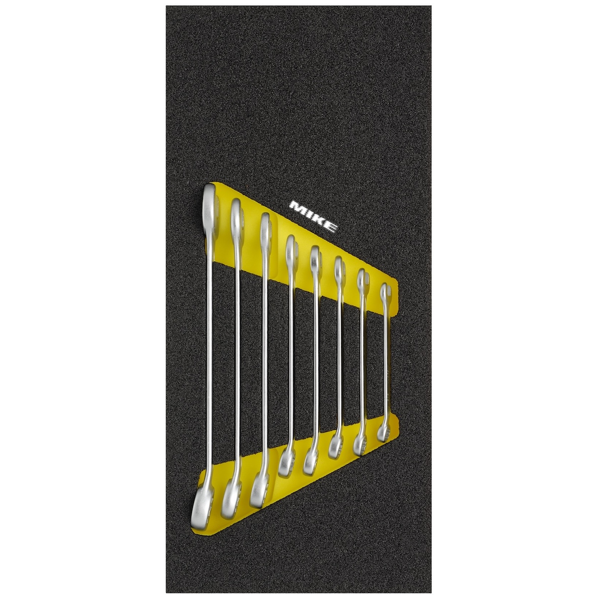 Bộ cờ lê vòng miệng được chứa trong một ngăn chứa làm từ bọt mềm. Màu đen với màu vàng nổi bật, kích thước rộng 41.0 cm và sâu 18.9 cm. Ngăn chứa này giúp bảo quản cờ lê khỏi bụi bẩn và tác động từ môi trường. Chống lại dầu mỡ và hóa chất, giữ cho cờ lê luôn sẵn sàng sử dụng trong mọi tình huống.