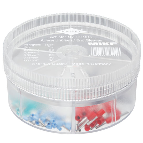 Knipex 97 99 905 là hộp đầu cos cách điện gồm 150 cái, phù hợp cho dây dẫn từ 0.25 đến 1 mm². Hộp có dạng tròn, đường kính 90 mm, cao 44 mm, dễ dàng đặt vào ngăn kéo, hộc dụng cụ hoặc mang theo bên người.