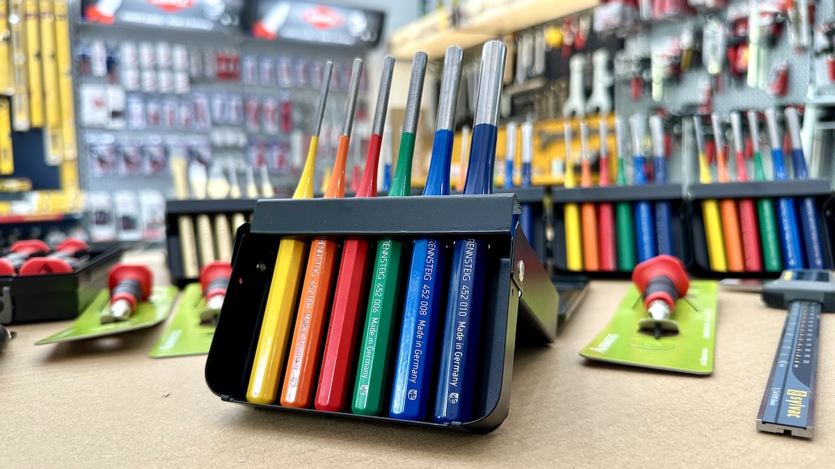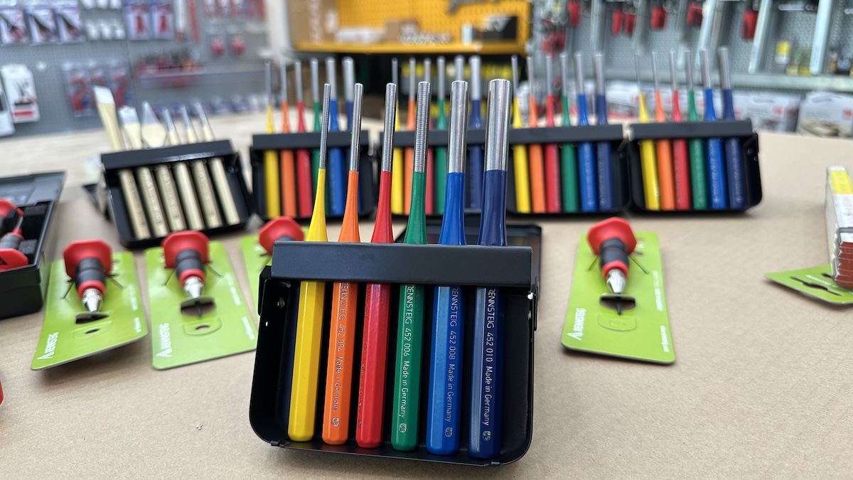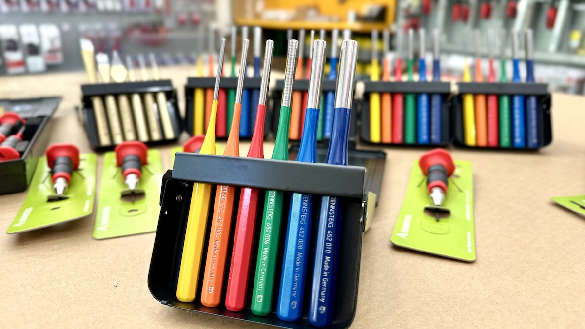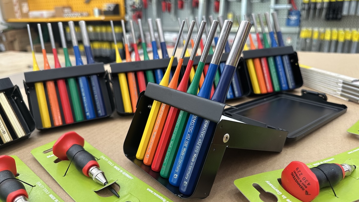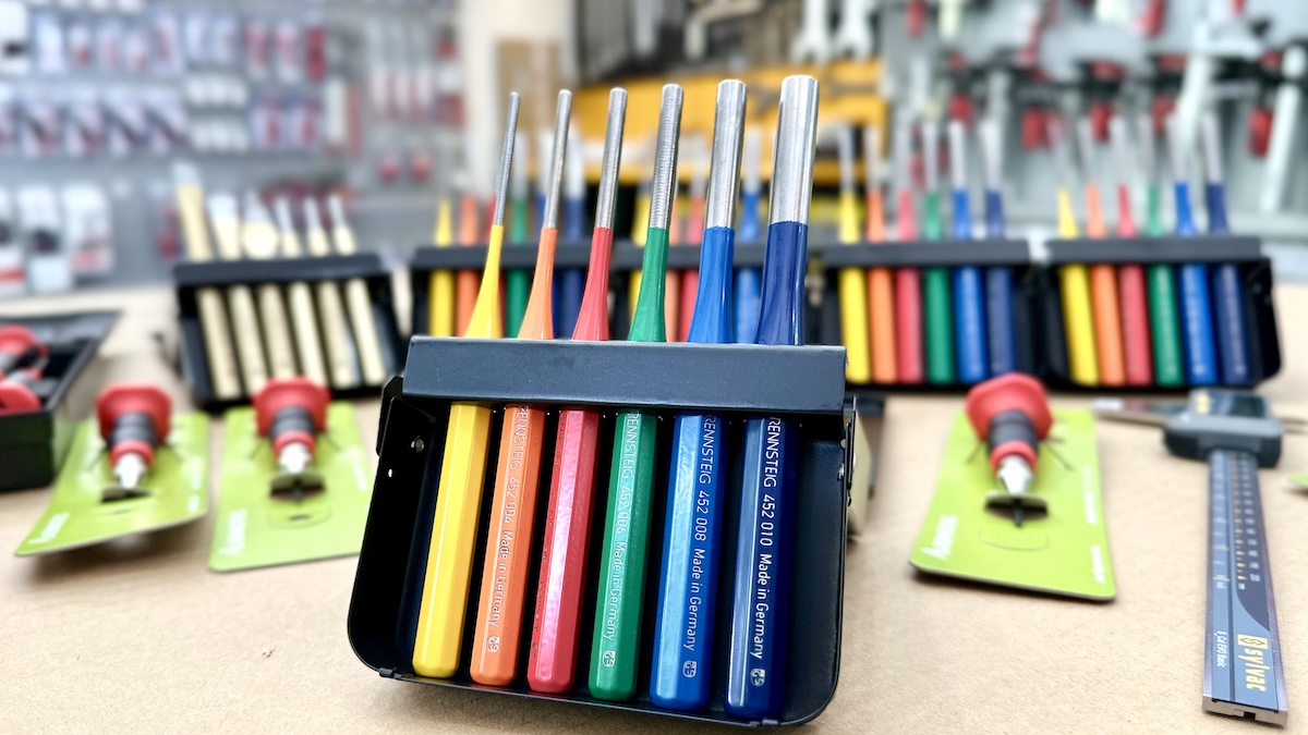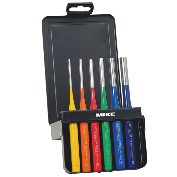 Bộ đột chốt “Exclusive” 6 cây Rennsteig 425 530 6 RC sản xuất tại Đức. Dùng để đóng ra hoặc tháo bu-lông, đinh tán, chốt chẻ và các chốt khác khỏi lỗ xuyên. Ngoài ra, có thể sử dụng để chôn chìm chính xác các loại chốt này vào bề mặt chi tiết gia công. Tất cả đột song song trong bộ đều được rèn từ thép dụng cụ cao cấp.