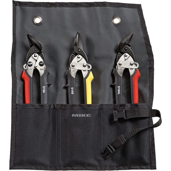 Bộ kéo cắt tôn 3 cây DSET15 trọn bộ với đủ các hướng cắt và bo cua. Bộ kéo gồm có ba cây kéo được thiết kế đặc biệt cho ba loại cắt khác nhau: cắt thẳng, bo cua trái, và bo cua phải. Tất cả đều được chứa gọn trong một túi vải tiện lợi, dễ dàng cuộn lại và mang theo. Nhỏ gọn.