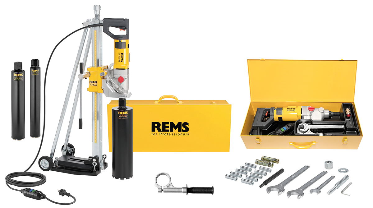 REMS Picus S3 Set UDKB 62-82-132 Titan là bộ khoan lõi chuyên nghiệp kết hợp máy Picus S3 2200 W, chân đế gá máy khoan REMS Titan và 3 mũi kim cương UDKB Ø62, Ø82, Ø132 mm.