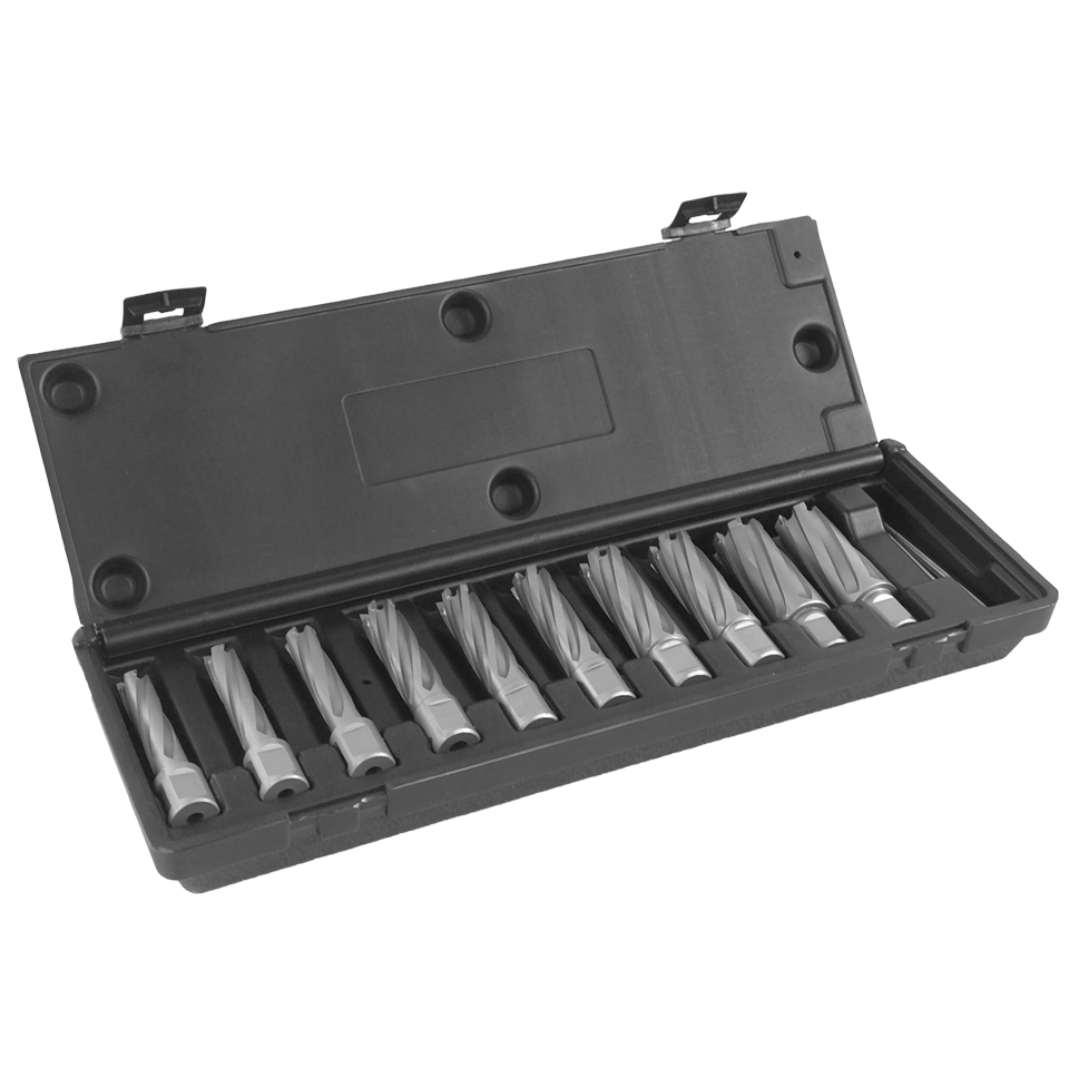 Our TCT.KIT/10L-M1 contains Tungsten Carbide Tipped Annular Cutters. Euroboor TCT cutters are equipped with a spiral flute which creates optimum chip removal and makes seizure next to impossible. Our TCT cutters are equipped with high precision WelNit shanks. The TCT.KIT/10L-M1 is a ten piece TCT cutter sets with DoC 55 mm. The set comes with two pilot pins. Besides TCT cutter sets with metric sizes, we also over TCT cutter sets with imperial sizes. And both ten and six piece TCT cutter sets. This set contains: 3 x HMLU.140, 3 x HMLU.180, 2 x HMLU.2020, 2 x HMLU.260, 1 x IBC.80, 1 x IBC.90. Packed in plastic case.
