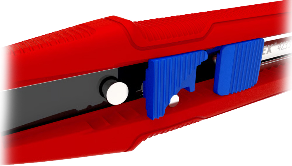 Cơ cấu khóa lưỡi trên Knipex CutiX 90 10 165 BK. Sử dụng chốt thép tôi cứng giữ chặt thân lưỡi bẻ gãy tại vị trí làm việc. Khi thực hiện thao tác cắt, đẩy, gọt hoặc cạo, lưỡi được giữ vững, không bị trượt lùi lưỡi vào thân.