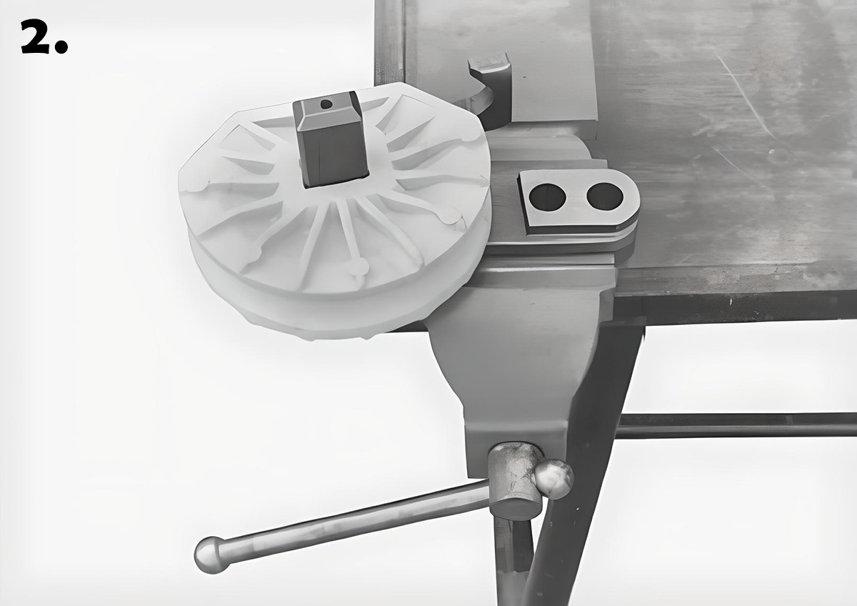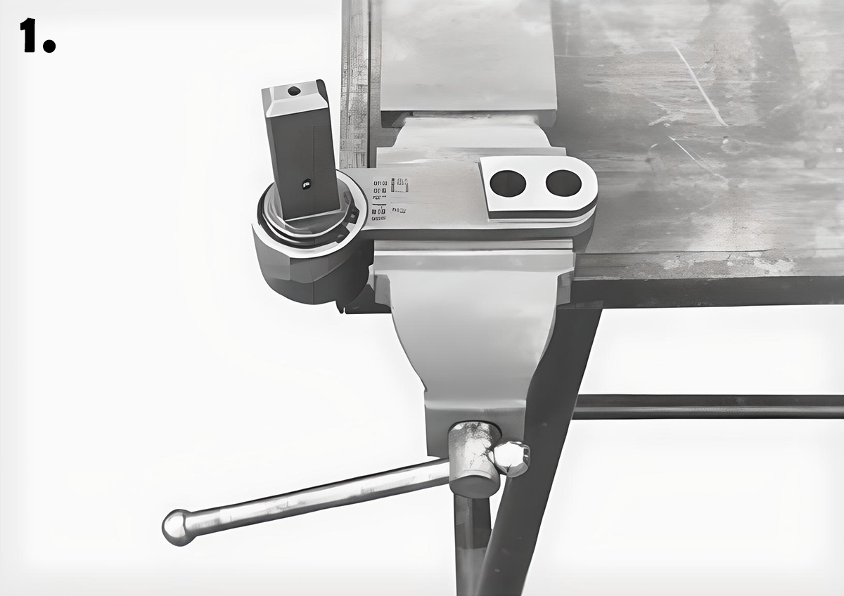 - Cố định chắc chắn bộ truyền động của dụng cụ uốn trong ê tô và đặt trục chính về vị trí bắt đầu (Hình 1).