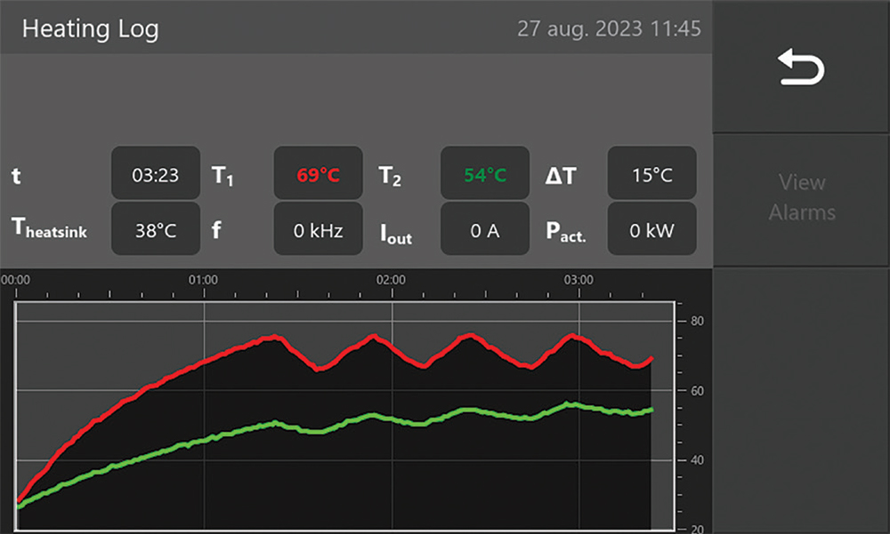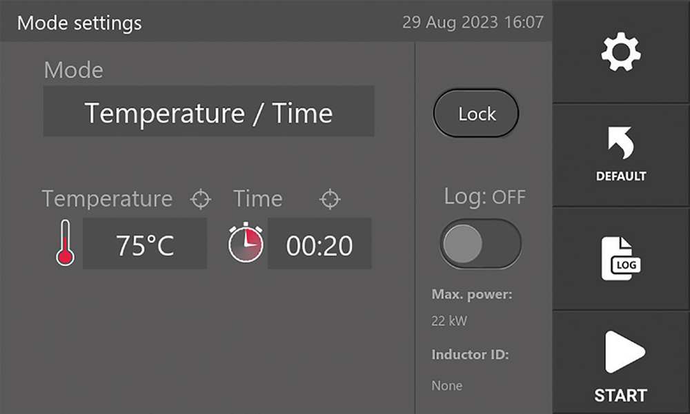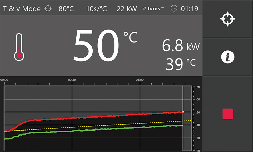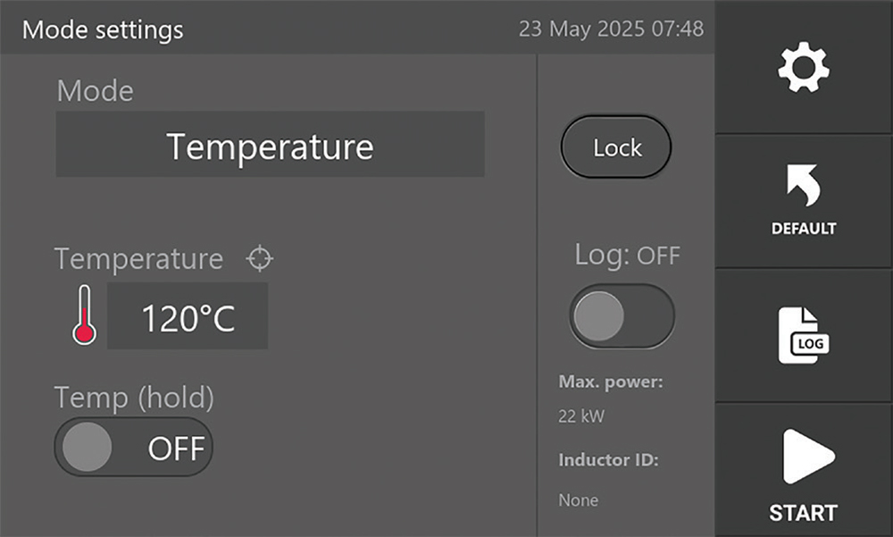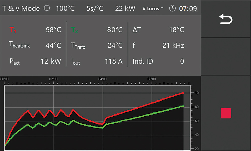 Giao diện cảm ứng 7 inch hiển thị rõ đồ thị gia nhiệt, hỗ trợ ghi dữ liệu và quản lý thông qua USB hoặc mạng nội bộ. Bộ điều khiển trung tâm sử dụng thuật toán điều biến công suất mới, giúp kiểm soát nhiệt độ chính xác hơn và bảo vệ cuộn cảm khỏi quá tải.