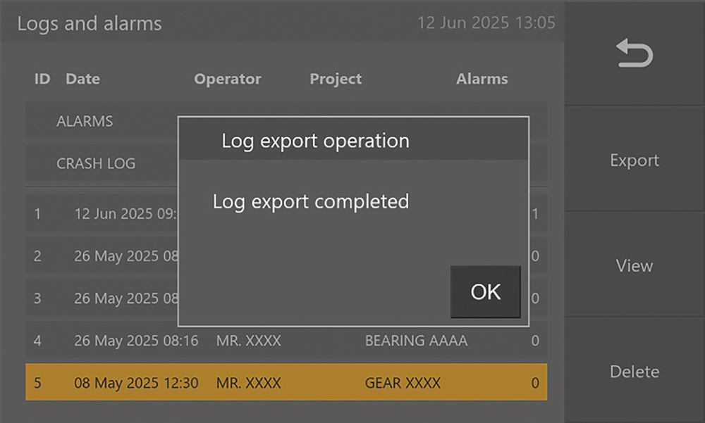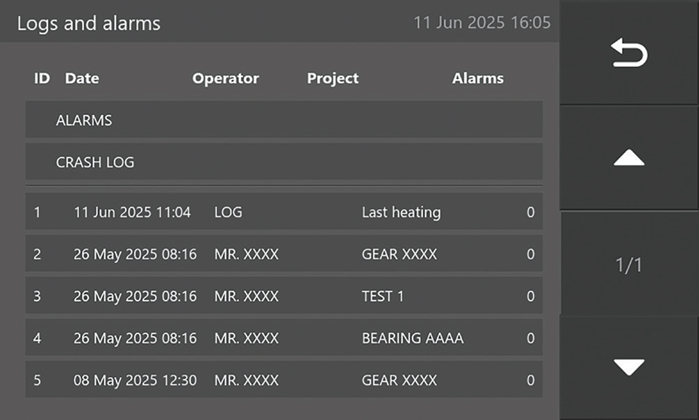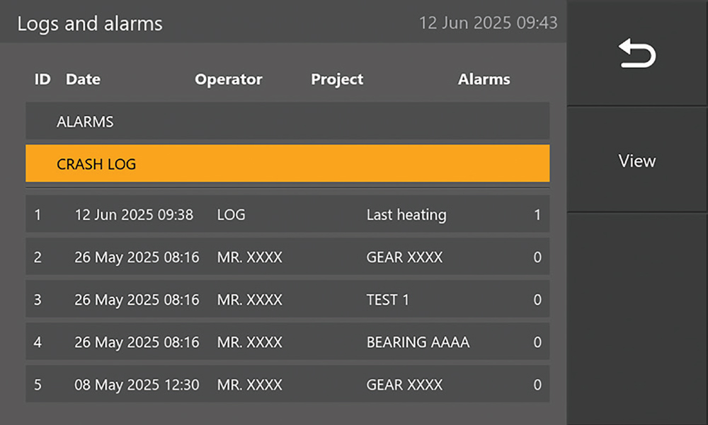 Hai loại nhật ký trên cùng – [Alarms] và [Crash log] – được lưu tự động. Các loại tiếp theo là [Heating logs] có mã ID hệ thống gán, cùng với Ngày & Giờ, tên Operator và tên Project được nhập thủ công. Các tệp này được lưu miễn là người dùng bật chức năng log.