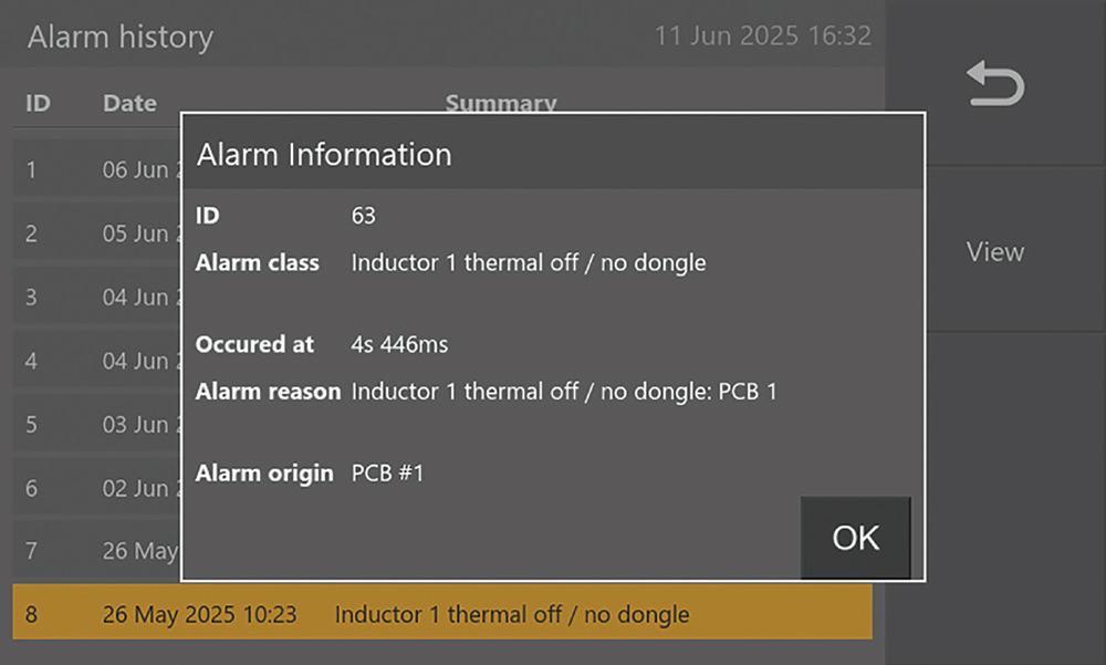 - Alarm origin – Nguồn phát sinh cảnh báo (ví dụ PCB #1, Bộ nguồn hoặc Cảm biến nhiệt cuộn cảm).
