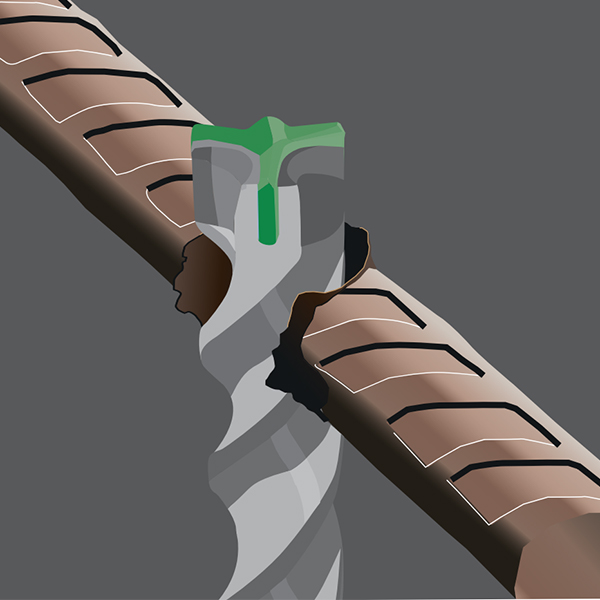 - 3 cutting edges: Đầu mũi gồm 3 cạnh cắt bằng hợp kim nguyên khối (carbide monobloc), cho phép mũi cắt qua bê tông và cốt thép dễ dàng, hạn chế kẹt hoặc lệch hướng khi khoan.