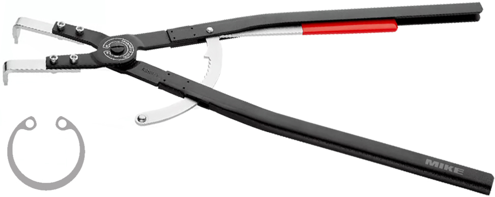 Kìm đầu cong 90° chuyên tháo lắp vòng hãm lớn Ø122–400 mm. Mũi thép tôi dầu Ø3.5 mm và Ø4 mm, có thể thay rời. Thân thép cuộn phủ sơn tĩnh điện đen chống mài mòn. Cơ cấu khóa giữ ổn định khoảng mở. Tiêu chuẩn DIN 5256 D.