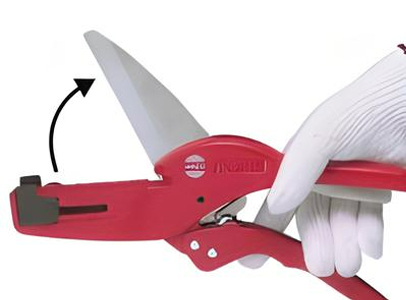 | Khả năng cắt Có thể cắt được nhiều loại vỏ bọc bảo vệ bằng nhựa như loại dùng cho dây điện sàn, dây điện trong nhà, hay ống dẫn tái thiết. | Chốt chặn (stopper) Chốt chặn gắn ở đầu dụng cụ có thể trượt được. Bằng cách trượt theo vật liệu, luôn có thể cắt ở vị trí tối ưu nhất phù hợp với từng loại vật liệu. | Cắt góc 45° Chỉ cần thay đổi hướng của chốt chặn một bên là có thể cắt góc 45° một cách dễ dàng. Đây là tính năng hữu ích khi xử lý các góc sàn hay khu vực không thể che phủ hoàn toàn bằng góc vuông. | Mở lưỡi dao bằng một chạm Khi mở tay cầm, lưỡi dao sẽ tự động mở ra nhờ cơ chế “mở một chạm”. Tính năng này cho phép thao tác bằng một tay, giúp nâng cao đáng kể hiệu suất làm việc. | Cơ chế bánh cóc (ratchet mechanism) Áp dụng công nghệ từ kéo cắt ống nhựa, cơ chế bánh cóc truyền lực hiệu quả đến mũi lưỡi dao. Quá trình cắt diễn ra nhẹ nhàng mà không để lại phoi cắt. |