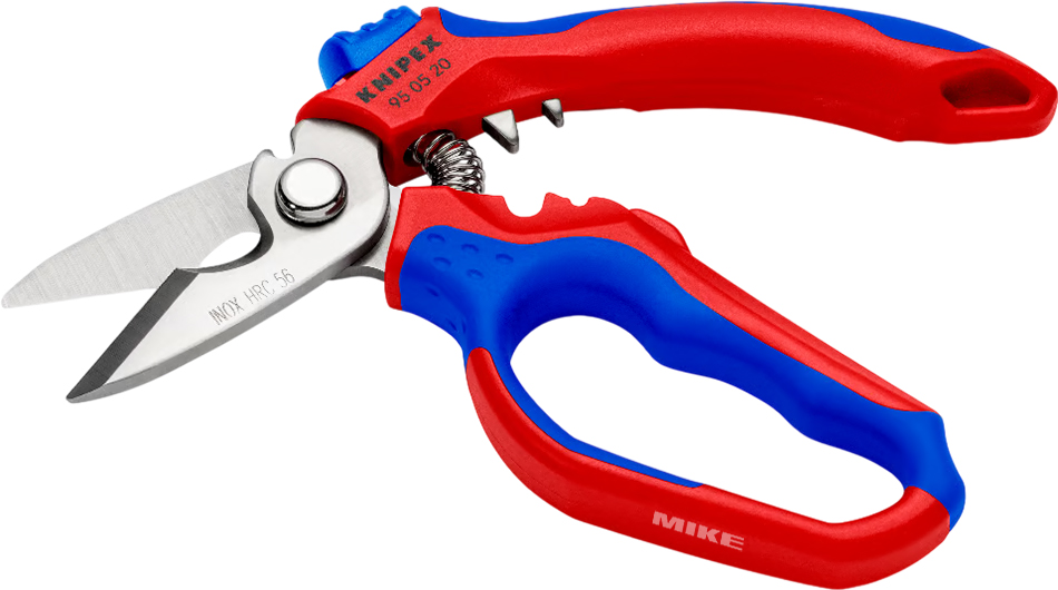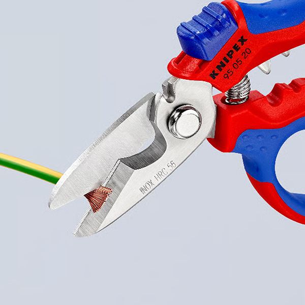 Kéo thợ điện mỏ cong Knipex 95 05 20 SB cắt dây mềm Ø đến 15 mm, lưỡi nghiêng chống trượt, bấm cos 0.5–25 mm². Lưỡi thép không gỉ cứng 56 HRC, có lò xo mở và khóa gập.