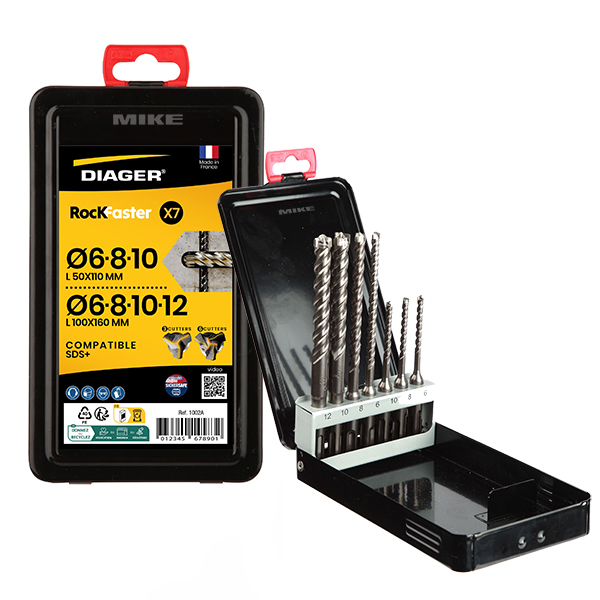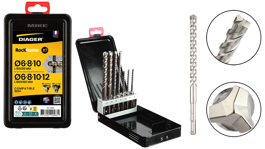 Bộ mũi khoan DIAGER ROCKFASTER 1002A gồm 7 chi tiết chuyên dùng cho bê tông cốt thép, được sản xuất tại Pháp. Đầu mũi khoan làm bằng hợp kim 100% carbide nguyên khối với số lượng lưỡi cắt thay đổi theo đường kính, đảm bảo khả năng phá vỡ bê tông cốt thép nhanh chóng và chính xác.