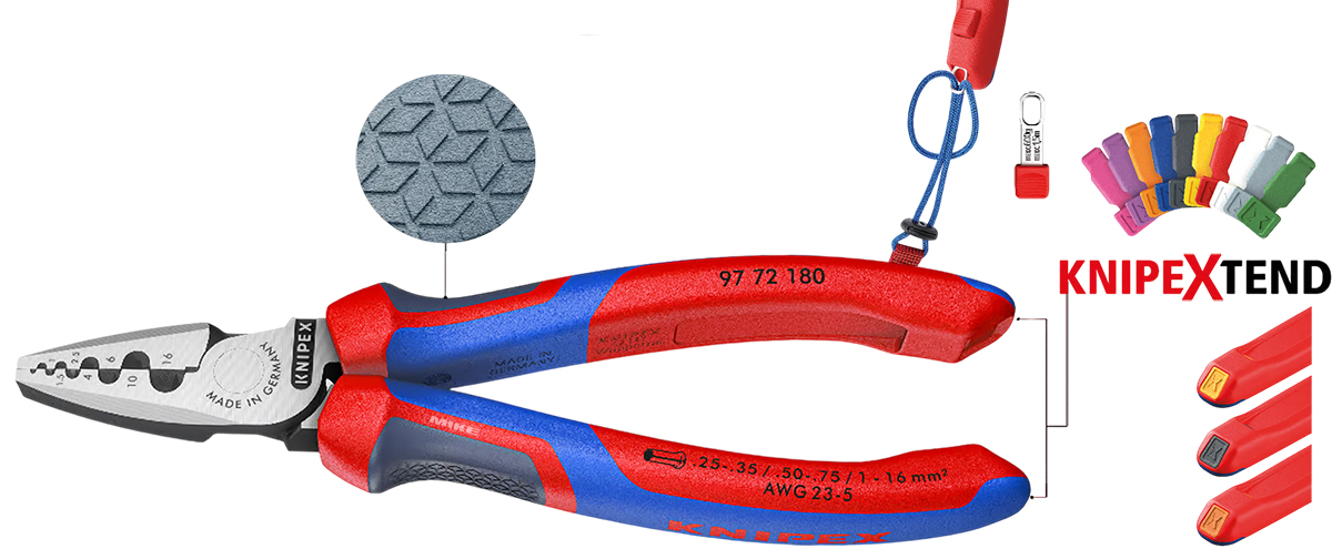 Kìm Knipex 97 72 180 có điểm nhấn ở tay cầm bọc ba thành phần nhựa kết hợp (multi-component grips). Cán có thiết kế tối ưu công thái học, tăng độ bám. Giảm lực tác động lên tay trong suốt quá trình bấm cos. Giúp người dùng làm việc thoải mái, ít bị mỏi hơn. Kìm bấm cos được trang bị sẵn hai điểm kết nối chuẩn KNIPEXtend. Dùng để gắn thêm các phụ kiện mở rộng khi cần thiết. Phù hợp hơn với điều kiện làm việc đặc biệt.