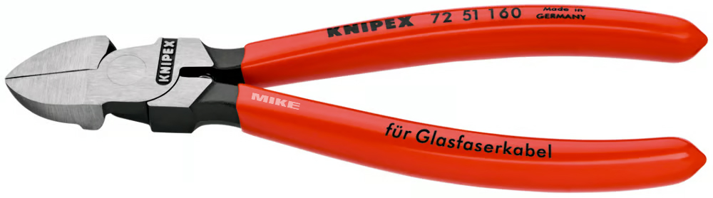 Kìm cắt cạnh Knipex 72 51 160 thiết kế riêng cho việc cắt sợi cáp quang. Cắt loại vật liệu giòn, dễ nứt gãy và không chịu được lực ép lệch. So với dây đồng hoặc dây kim loại, sợi quang yêu cầu dụng cụ cắt có lưỡi sắc, phẳng và ổn định về hình dạng. Nhằm hạn chế tối đa việc nứt mép hoặc vỡ cạnh cắt sau khi thi công.