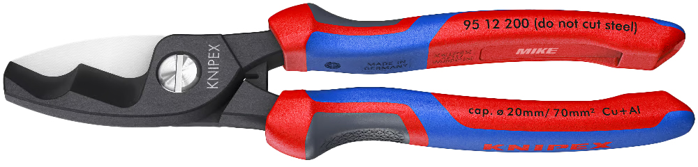 Kìm cắt cáp Knipex 95 12 200 dài 200 mm, thiết kế chuyên biệt để cắt cáp mềm bằng đồng hoặc nhôm, tiết diện đến 70 mm². Đây là dòng kìm lưỡi cắt đôi (twin cutting edge), chia quá trình cắt thành hai giai đoạn riêng biệt. Phần lưỡi trước dùng để cắt lớp vỏ cách điện.