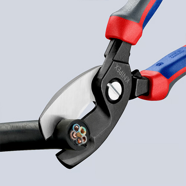 Dùng cắt cáp mềm đồng hoặc nhôm Ø 20 mm (70 mm²). Lưỡi cắt đôi chia quá trình cắt thành hai pha, cắt gọn vỏ và lõi mà không làm bẹp dây. Tay cầm ba lớp công thái học, có cổng KNIPEXtend gắn đầu nối dài. Lưỡi tôi cứng ~56 HRC. Khớp vít điều chỉnh được, có ốc tự giữ.