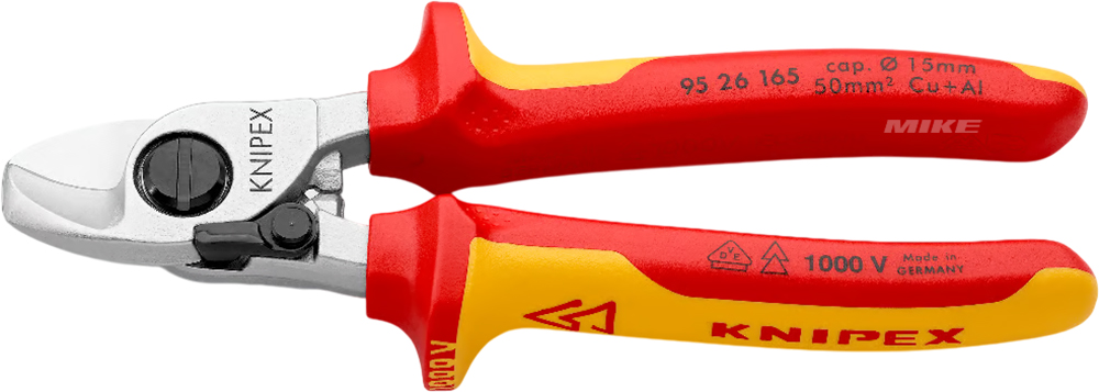 Kìm cắt cáp Knipex 95 26 165 được thiết kế chuyên biệt để cắt cáp điện đồng hoặc nhôm mềm đến 50 mm² (Ø 15 mm) bằng một tay, thao tác nhẹ, không làm bẹp dây. Dòng kìm này có cán cách điện đạt chuẩn VDE theo tiêu chuẩn DIN EN 60900 / IEC 60900, đảm bảo an toàn khi làm việc gần điện áp đến 1000V AC.