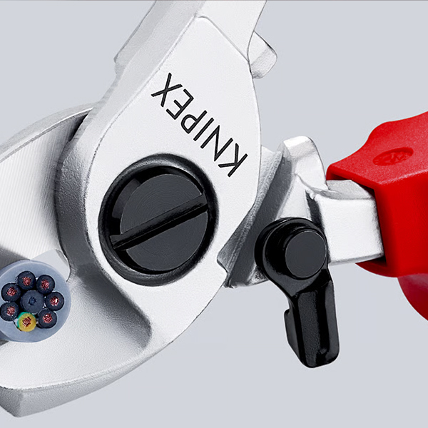 Khác với kìm cắt cạnh và kìm chéo, dòng kìm cắt cáp của Knipex dùng cơ cấu cắt kiểu kéo – hai lưỡi cắt áp sát và trượt chéo lên nhau như kéo thép. Nhờ đó, cáp mềm không bị ép bẹp như khi dùng kìm chéo. Mặt cắt dây sạch, không xé vỏ, phù hợp cho các thao tác lắp cos, đấu nối, siết vít hoặc đưa vào máng.
