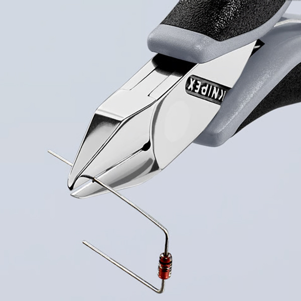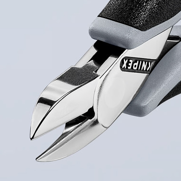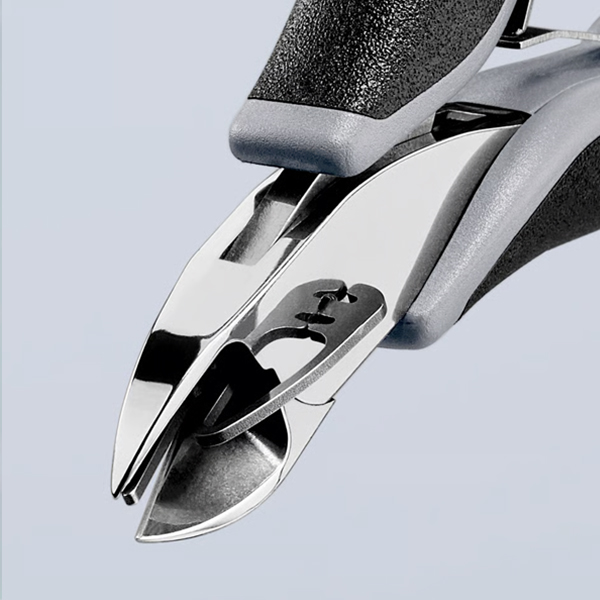 Tay cầm công thái học. Thiếu kế multi-component grips hai màu (đen/xám). Cổ cao, ôm trọn lòng bàn tay, có điểm tì ngón tay cái và ngón trỏ. Tạo cảm giác thoải mái, chống trượt. Giúp người dùng điều khiển chuẩn xác trong thao tác. Nhờ tỷ số truyền lực cao, kìm ESD Knipex giúp giảm đáng kể lực tay cần thiết. Đặc biệt hữu ích trong các công đoạn lặp lại hoặc khi cắt nhiều chân linh kiện nhỏ.