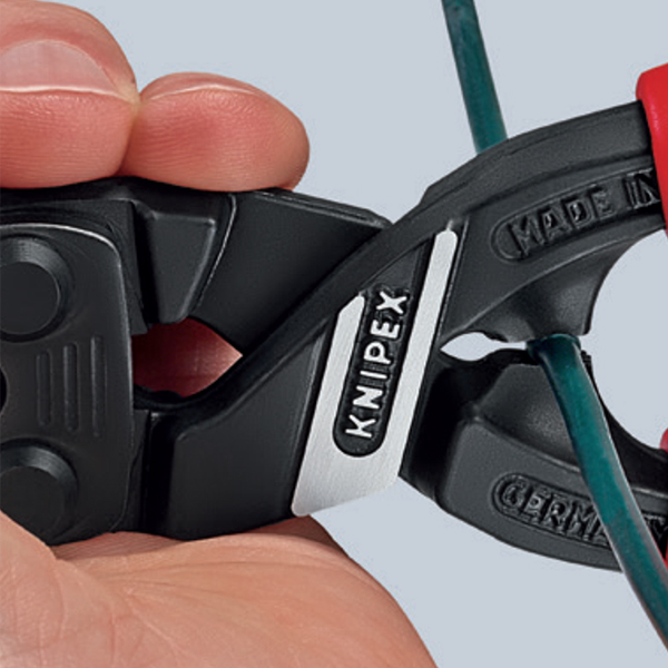Kìm cắt cộng lực Knipex 71 32 200 nhỏ gọn thuộc dòng CoBolt. Chiều dài 200 mm, dùng tay đơn, tích hợp lưỡi cắt có rãnh để xử lý dễ hơn các vật liệu dày. Lưỡi cắt tôi cảm ứng đạt độ cứng khoảng 64 HRC, cắt được bu lông, đinh tán, dây đàn Ø 3.6 mm. Cơ cấu truyền lực hiệu quả, tay nắm hai lớp chống trượt, tích hợp lò xo mở và khóa gập vận chuyển.