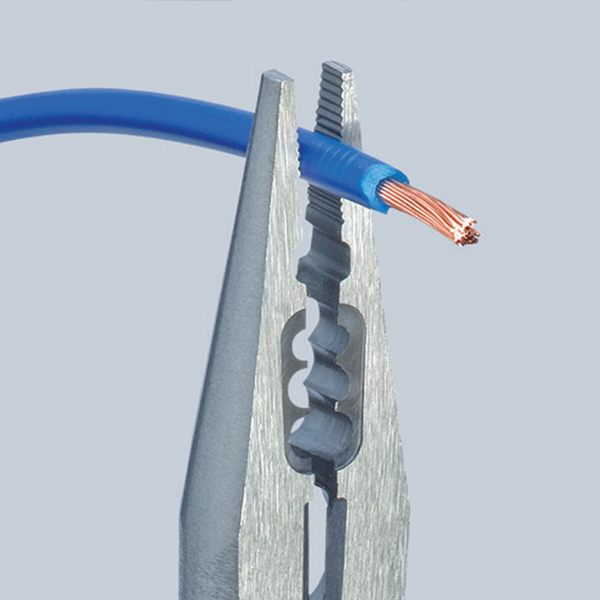 Phần lưỡi cắt được cảm ứng tôi cứng, đạt độ cứng khoảng 60 HRC. Cho phép xử lý dây mềm Ø 2,5 mm và dây cứng trung bình Ø 1,6 mm. Ngoài ra, vùng bấm cos tích hợp ngay trên đầu kìm. Phù hợp với các tiết diện dây ferrules tiêu chuẩn 0,5–2,5 mm².