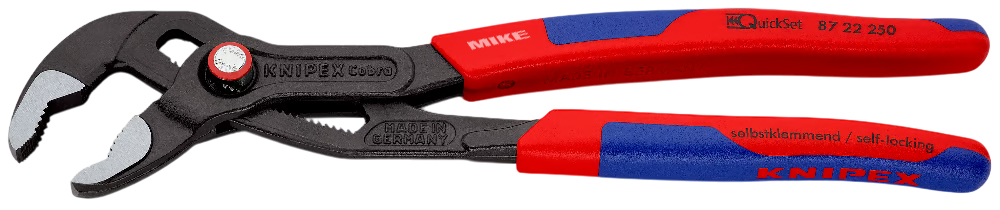 Kìm mỏ quạ Knipex 87 22 250 cải tiến theo công nghệ QuickSet của dòng Knipex Cobra®. Mẫu này dài 250 mm, hàm mở rộng tới 50 mm (tương đương 2 inch đường kính ống hoặc êcu 46 mm). Dùng cơ chế trượt để điều chỉnh nhanh trên chi tiết. Thay vì phải bấm nút từng nấc như truyền thống.