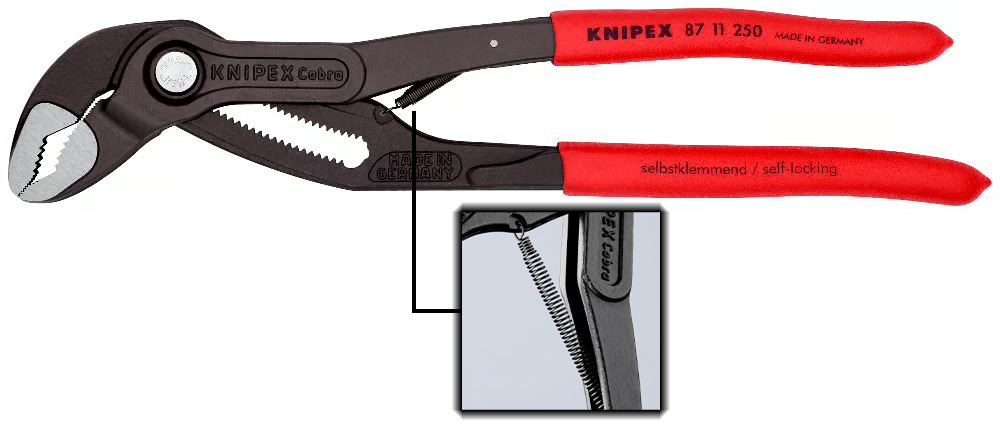 - Giữ nguyên toàn bộ tính năng của kìm Knipex Cobra® 87 01 250 – tự kẹp, tiếp xúc ba điểm, rãnh cắn dọc & chéo, cấu trúc khớp hộp đôi, chặn kẹp tay, răng tôi cao tần ~61 HRC…