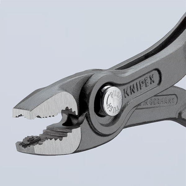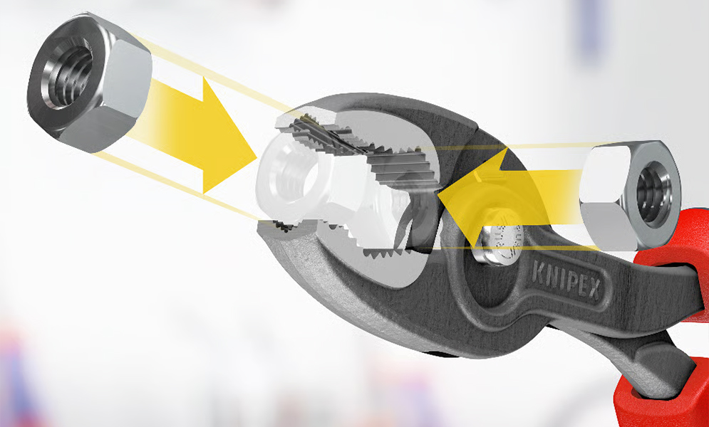 Điểm nổi bật của Knipex TwinGrip 82 02 150 nằm ở phần ngàm trước “cắn” sâu. Răng kẹp khỏe cùng tỉ số truyền lực tập trung ngay tại đầu ngàm. Cấu trúc răng đối xứng. Bề mặt kẹp kết cấu răng cưa, bám chặt đầu ốc bị tròn cạnh, bị bavia hoặc mòn rãnh. Giúp người dùng xoay, nới lỏng hoặc siết chặt lại bu-lông, đai ốc một cách kiểm soát.