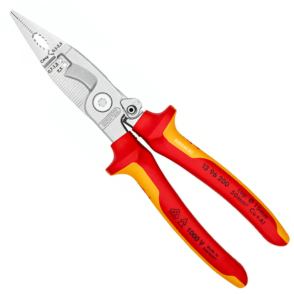 Cắt cáp Ø 15 mm, tuốt dây 0.75–2.5 mm², bấm cos 0.5–2.5 mm², nạo mép, uốn và giữ dây. Dài 200 mm, thép rèn, tay cầm nhựa hoặc cách điện VDE 1000V. Có bản mạ chrome, lò xo mở tay, khóa cắt và gắn dây an toàn.