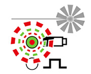 LED/laser beam lights up constantly LED/laser beam flashes LED flashes and changes colour |