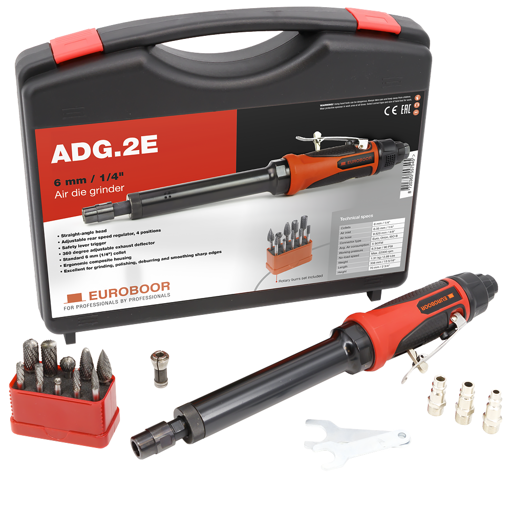 Máy mài khí nén, 22000 RPM. Euroboor ADG.2E-SET, đầu dài có tốc độ quay cao, thiết kế đầu dài giúp tiếp cận các vị trí sâu hoặc hẹp. Bộ sản phẩm bao gồm máy mài và bộ mũi mài, đáp ứng đa dạng nhu cầu gia công.