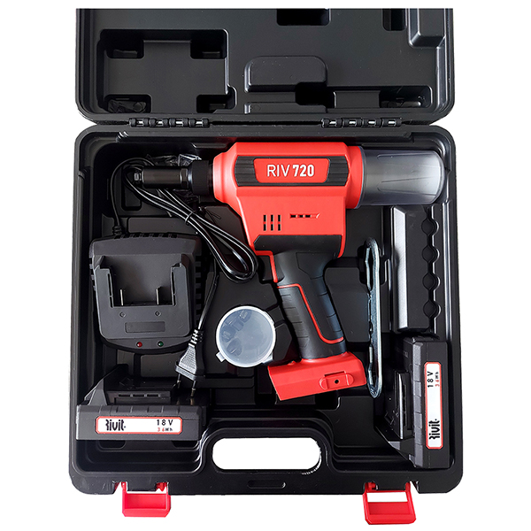 RIV720 được cung cấp cùng hộp đựng có tay xách và khóa gài. Bộ dụng cụ bao gồm: máy, pin, bộ sạc, bình chứa mẩu đinh tán và đầu bấm theo tiêu chuẩn. Thân máy tích hợp khoang chứa mẩu đinh phía sau, hạn chế tình trạng rơi vãi đầu rút trong quá trình thi công.