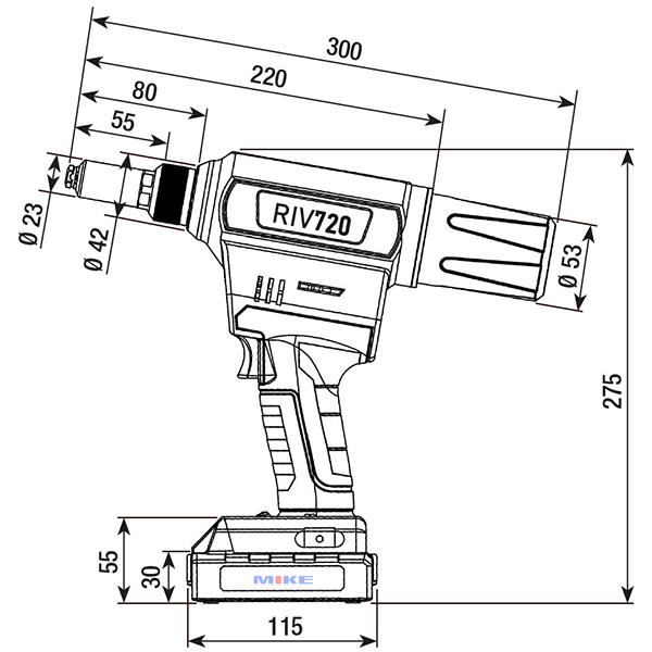 Máy bấm rút đinh tán RIV720 thuộc dòng dụng cụ dùng pin của Rivit Italy. Máy sử dụng cơ cấu kéo động cơ không chổi than và nguồn pin 18V – 2.0 Ah. Máy hỗ trợ thi công đinh tán mù từ Ø 2.4 mm đến Ø 6.4 mm. Bao gồm cả đinh tán kết cấu, trên các vật liệu như nhôm, thép và inox. Đây là thiết bị được thiết kế cho nhu cầu thi công di động hoặc tại xưởng. Dải ứng dụng bao phủ phần lớn các kích thước đinh tán phổ biến.