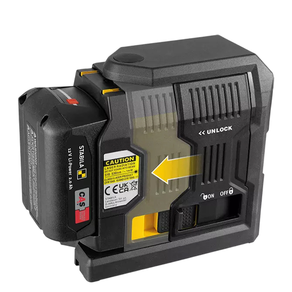 - Laser chữ thập tự cân bằng kết hợp điểm dọi dùng pin sạc CAS 12 V (Li-ion, 2.0 Ah).