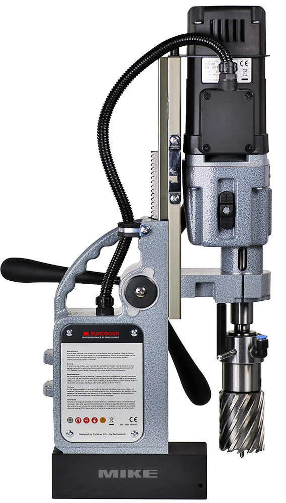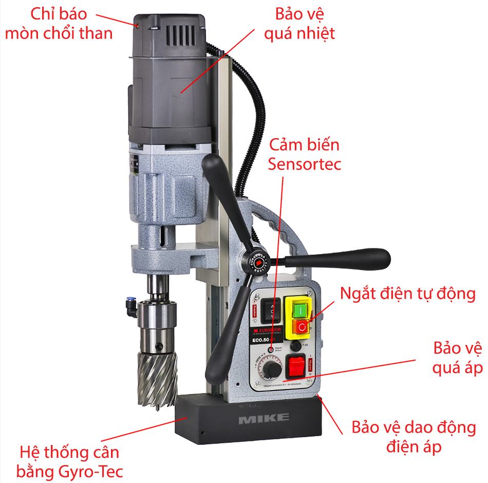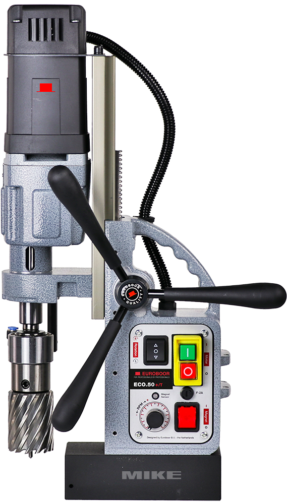 Máy khoan từ Euroboor ECO.50+/T dùng motor 1250 W, điện áp 220 – 240 V, tần số 50 – 60 Hz, chuyên cho khoan và taro. Máy đạt đường kính khoan lõi tối đa 50 mm, khoan mũi xoắn 23 mm, khoan vát 55 mm và taro ren đến M20. Lực hút nam châm 1850 kg, bảo đảm cố định chắc chắn khi gia công.