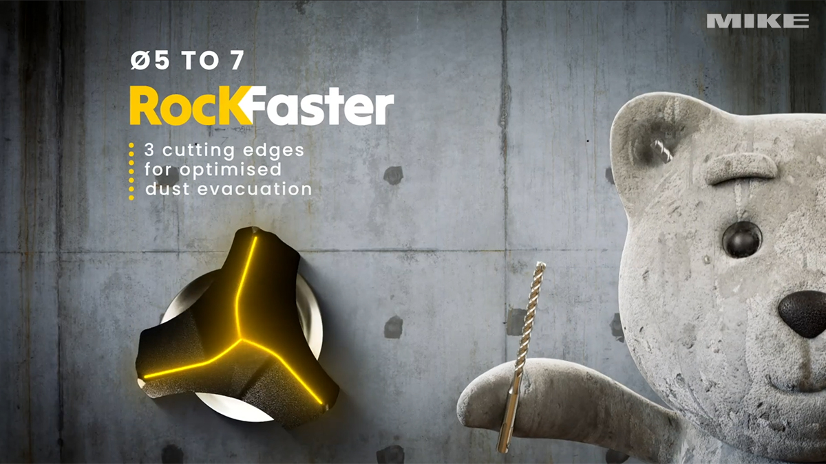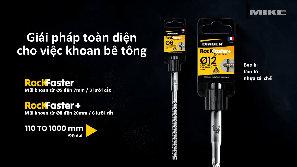 • Mũi khoan Rockfaster 118 dùng đầu hợp kim nguyên khối (100% carbide), giúp xuyên được cả bê tông lẫn thanh thép bên trong mà không bị nứt, không cong vênh.