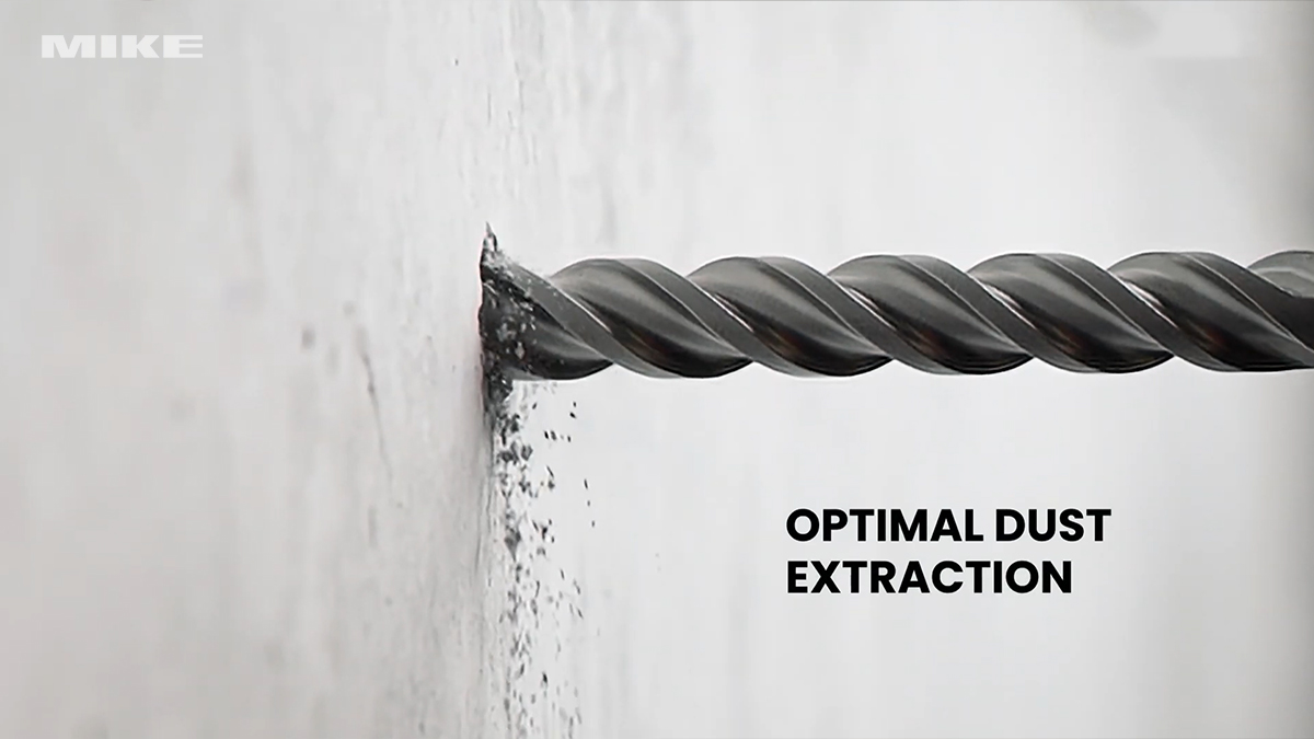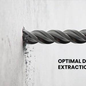 • Rãnh xoắn ba rãnh hình chữ U kết hợp với lòng rãnh rộng giúp hút bụi liên tục, giữ lưỡi khoan không bị quá nhiệt hay nghẽn khi khoan vào kết cấu dày đặc như bê tông cốt thép.