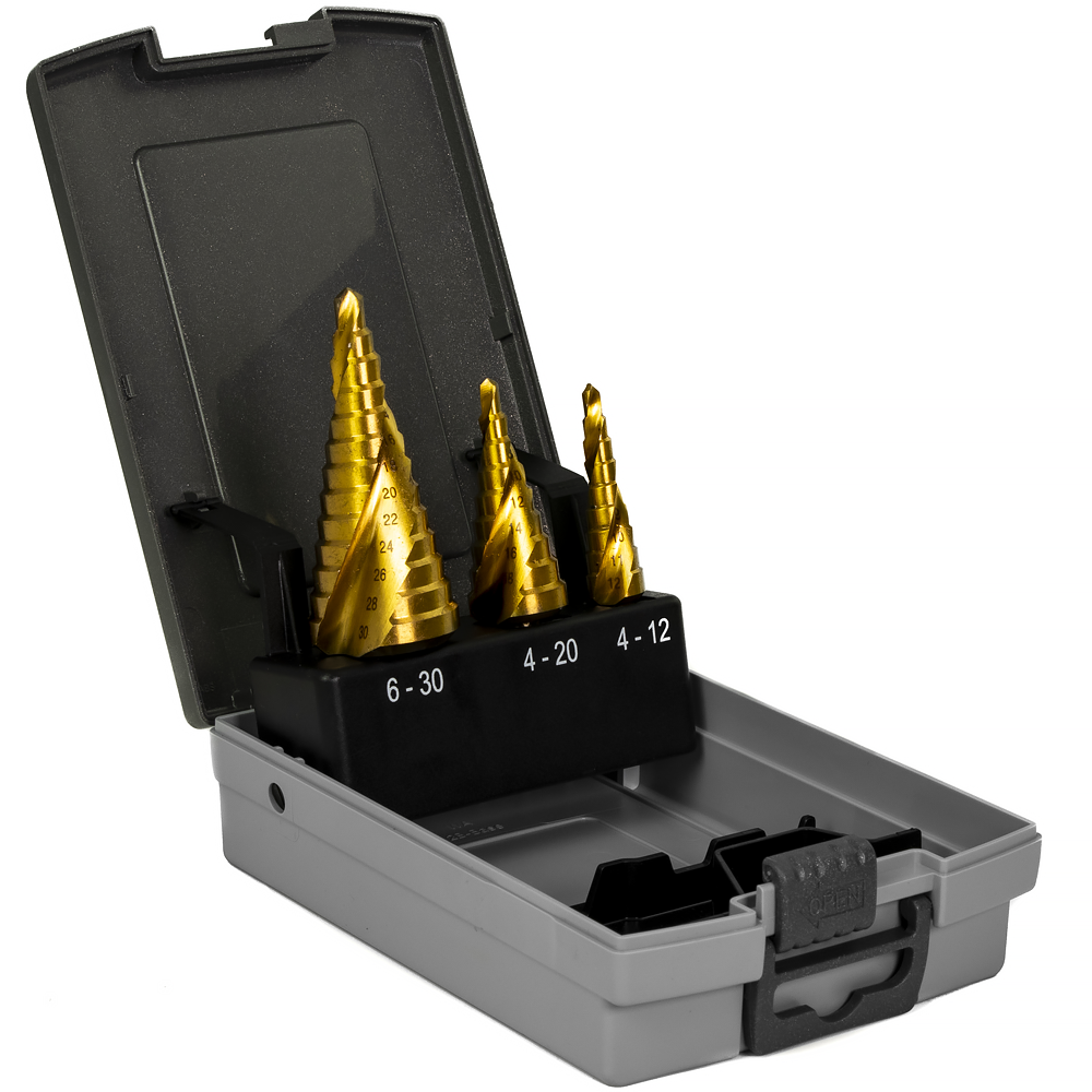 The Euroboor ESS.430/2 Step Drill Set includes three TiN-coated step drills (ESD.630, ESD.420, and ESD.412), suitable for hole sizes from ø 4 mm to ø 30 mm. Packed in a durable plastic case, this set is ideal for professionals working with stainless steel, aluminium/aluminum, brass, copper, and plastic. ESD.412 Ø: 4 – 12 mm Length: 65 mm Shank Size: 6 mm with 3 flats Step Size: 1 mm per step Number of Steps: 9 ESD.420 Ø: 4 – 20 mm Length: 75 mm Shank Size: 8 mm with 3 flats Step Size: 2 mm per step Number of Steps: 9 ESD.630 Ø: 6 – 30 mm Length: 97 mm Shank Size: 10 mm with 3 flats Step Size: 2 mm per step Number of Steps: 13