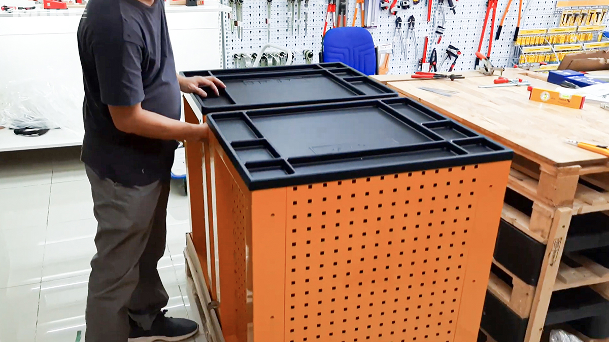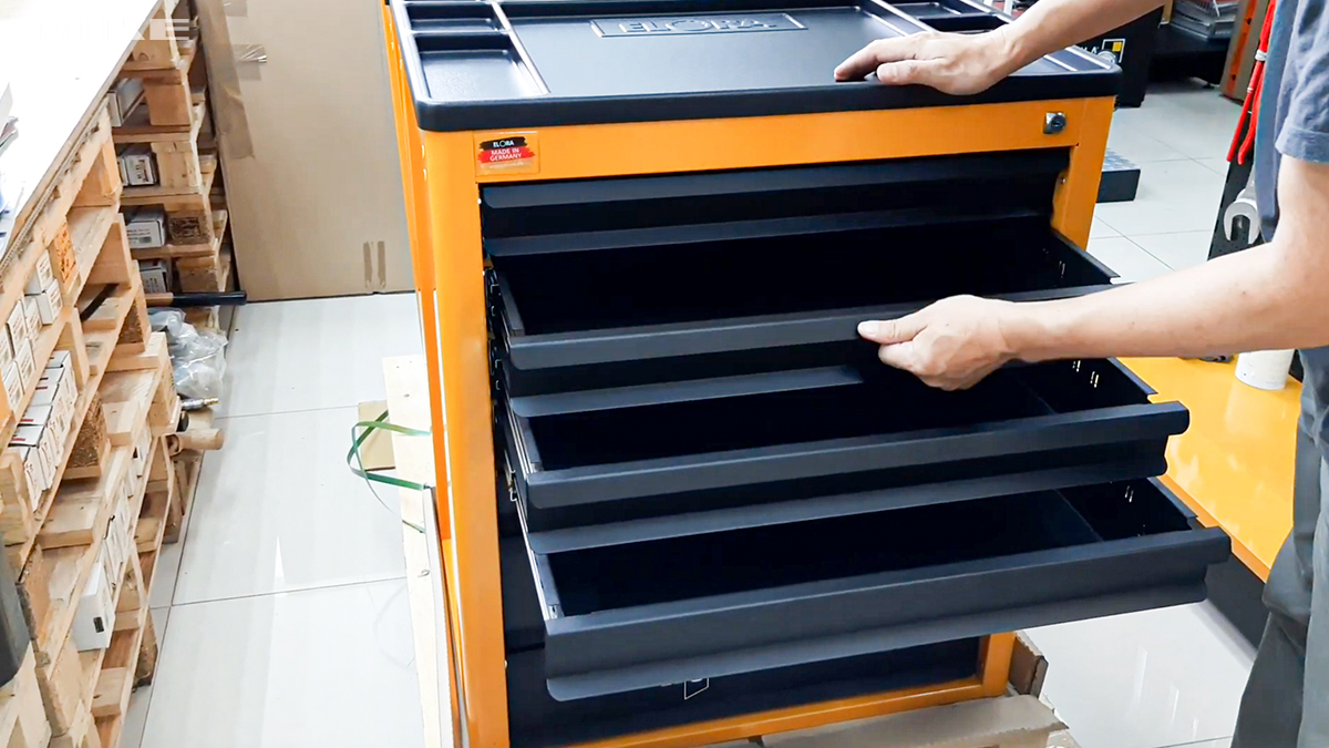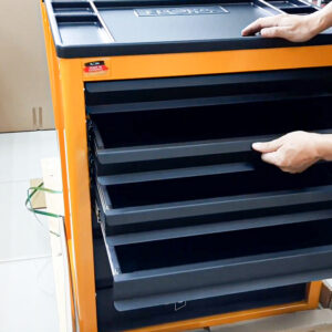 Nắp trên đỉnh của tủ dụng cụ 7 ngăn bằng nhựa, chịu va đập và bạn tháo rời được. Thuận tiện cho việc làm vệ sinh mặt tủ. Mặt tủ chia thành nhiều khoang chứa dụng cụ đồ nghề thao tác ngay.