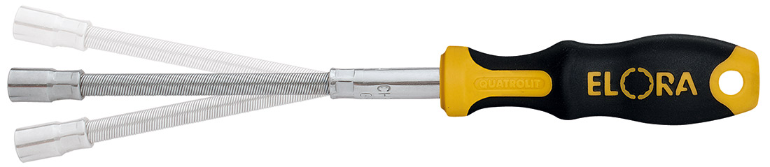 Tuốc nơ vít thân mềm có đầu kiểu tuýp ELORA 213. Hiểu cách đơn giản là cán thì tô vít, thân bẻ uốn mềm dẻo, đầu vặn giống socket. Kích thước đầu khẩu từ 5mm đến 10mm và thân mềm, bạn có thể vặn xoắn một cách dễ dàng. Tay nắm nhựa đúc 2 thành phần QUATROLIT®-2K.